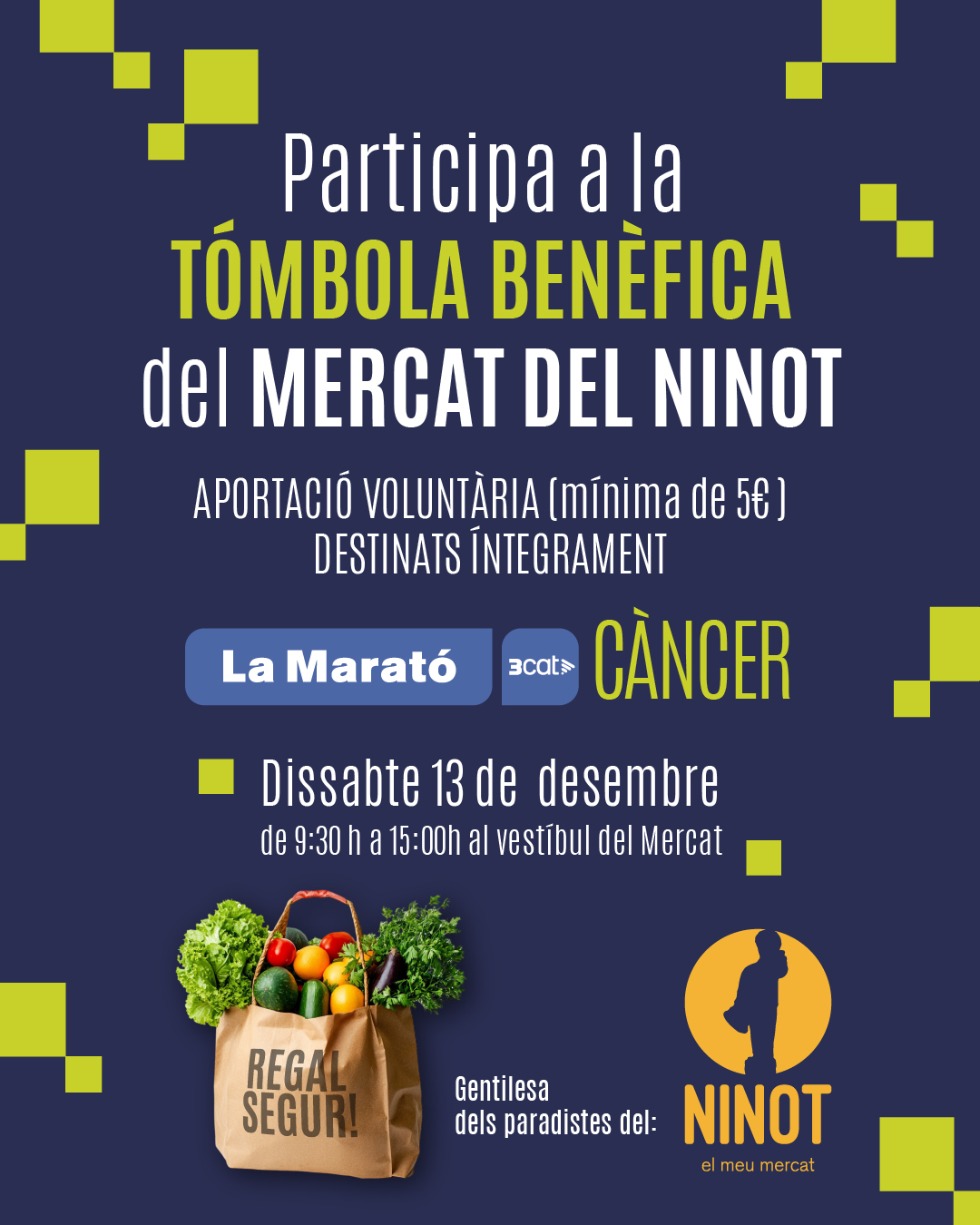 El dissabte 13 de desembre, el Mercat del Ninot organitza una Tòmbola Benèfica a favor de La Marató de TV3, dedicada a la recerca contra el càncer. La iniciativa tindrà lloc al vestíbul del mercat, de 9:30 h a 15:00 h. Amb una aportació voluntària......